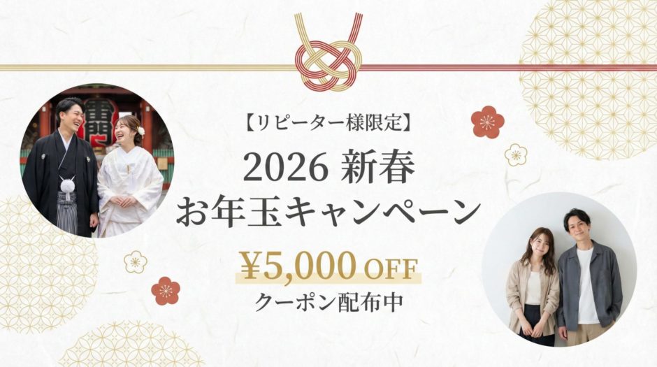 「前撮りはドレスだけだった」「両親に和装姿を見せたい」 「新年といえば和装」そんな想いを、新年のこの機会に叶えませんか? 初詣デートのついでに浅草で、あるいは帰省のタイミングで大阪で。 手ぶらで来店し、サクッと本格的な和装写真を。