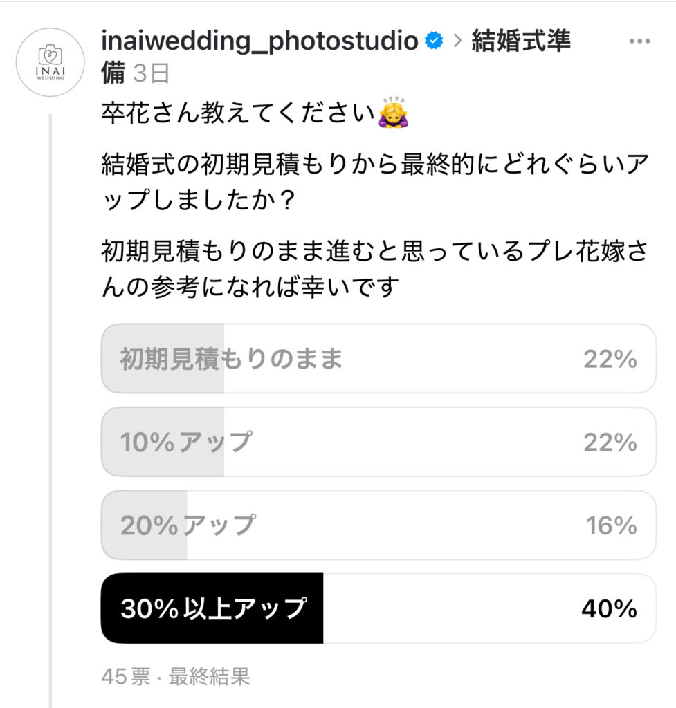 最も多かったのが30%以上アップしたという回答でした。結婚費用を抑えたいと考えている方は契約時が本当に大切です。