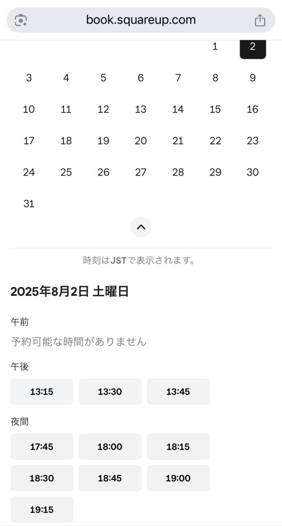 ▼ 下の「空き状況を確認する」から右上の「予約する」をクリック。プラン選択まで進み「予約」をクリックで “空いている日時”を確認できます。