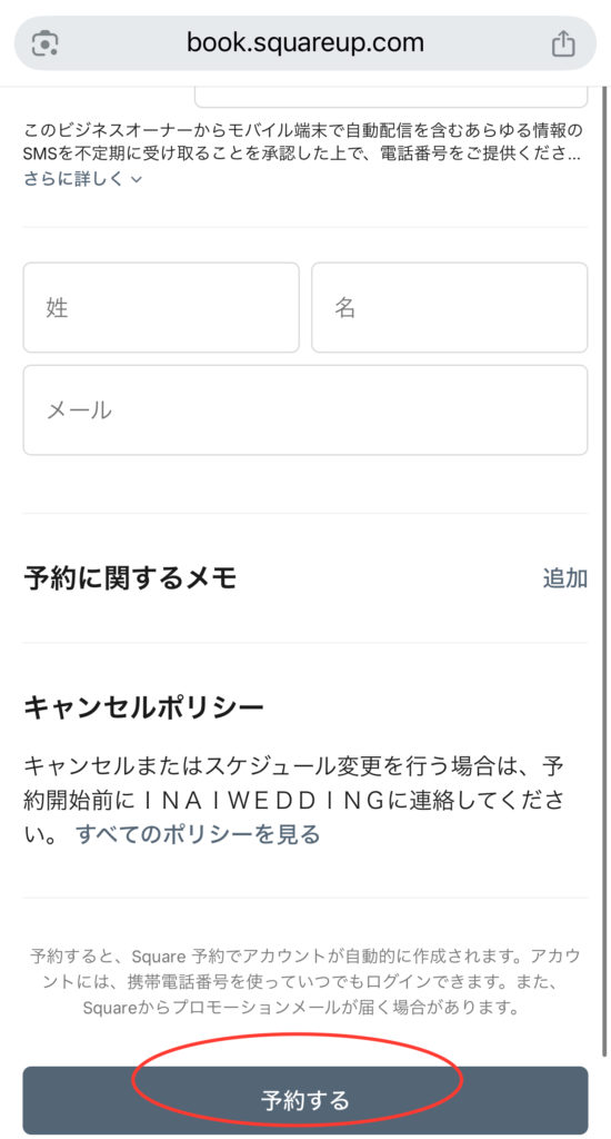 予約時に入力したメールアドレスに数日以内に「予約完了」メールが届きます。その他、衣装のサイズ確認等は公式LINEより行いますので、お手数ですが予約後に公式LINEまでご一報ください。